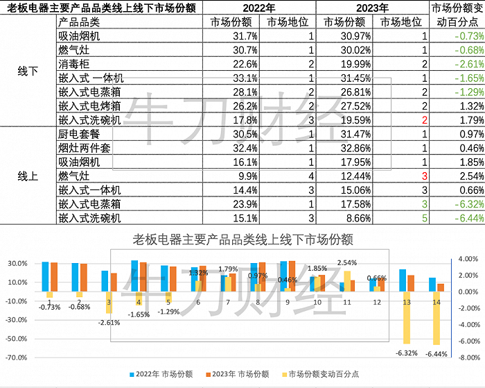 另外值得注意的是,对比2022年的市场份额可以发现,老板电器线上线下,一半的产品的市场份额呈现出下滑。