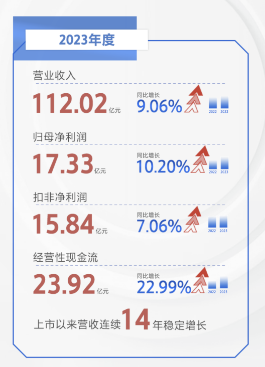 老板电器财报显示,其2023年营业收入112.02亿元,同比增长9.06%,连续14年稳定增长;归母净利润17.33亿元,同比增长10.20%。值得一提的是,老板电器业绩不仅实现连续14年增长,而且净利润增长高于营收,这体现了其强大的经营能力。