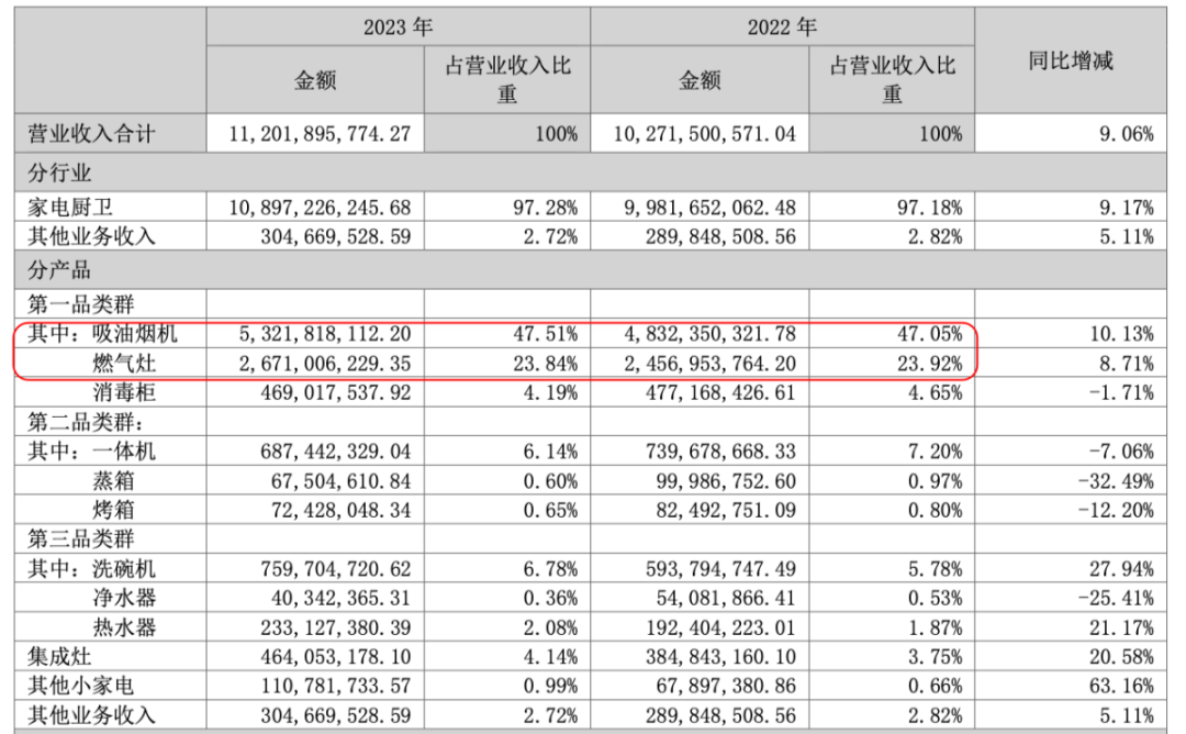 2023年两大拳头产品油烟机和燃气灶收入依然增长,但第二品类的一体机、蒸箱、烤箱全部同比下滑。