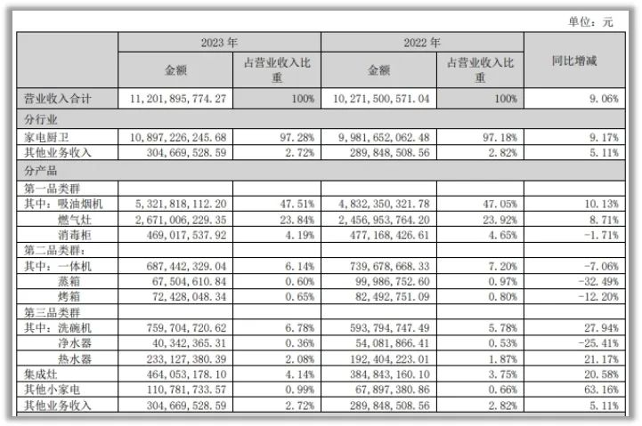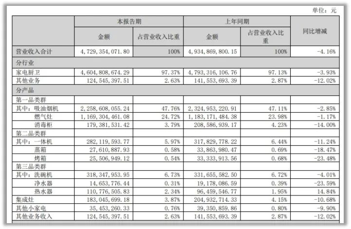 2023年两大拳头产品油烟机和燃气灶收入虽然保持增长,但第二品类的一体机、蒸箱、烤箱全部同比下滑,分别下滑7.06%、32.49%和12.2%。到了2024年上半年,所有品类全线下滑。