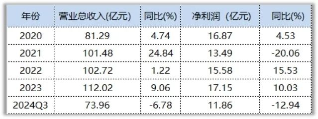 2024年前三季度净利润也双双下降,实现营收73.96亿元,同比下滑6.78%;净利润11.86亿元,同比减少12.94%。第三季度单季净利润降幅扩大至18.49%,创下上市以来最差单季表现。