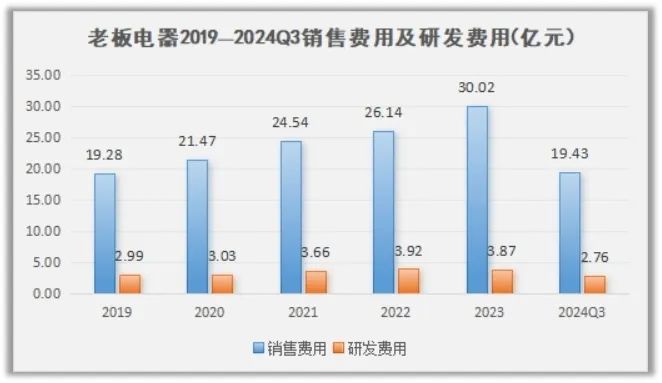 老板电器的高营销费一直被市场诟病,2023年其销售费用高达30亿元,而研发费用仅3.87亿元,投入占比不足4%。尽管推出“食神”大模型等创新产品,但实际技术落地效果存疑——数字厨电i系列虽同比增长,但整体营收贡献仍微不足道。
