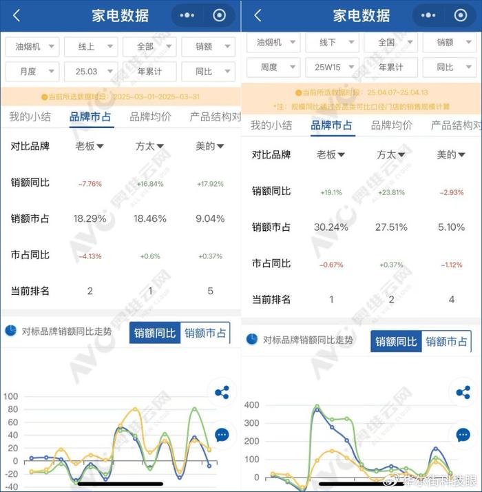 奥维数据罗盘的统计数据显示,今年3月,老板油烟机线上销额同比下降7.76%,市占同比下降4.13%。在老板电器的销售体系中,线下渠道是绝对的主力,但3月市占同样出现了小幅的缩水。
