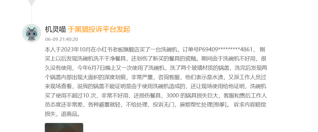 一名消费者投诉称,其于2023年10月购买了一台洗碗机(订单号:P69409*********4861),使用后发现餐具清洗不净,且新购餐具的瓷釉被划伤。