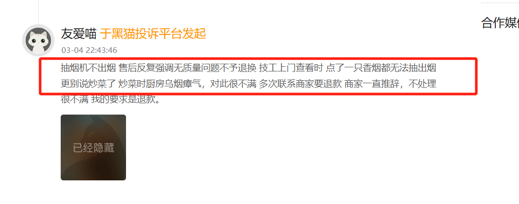 此前,另有消费者投诉称,购买的老板抽烟机抽不出烟。“技工上门查看时,点了一只香烟,甚至无法吸走香烟烟雾。”
