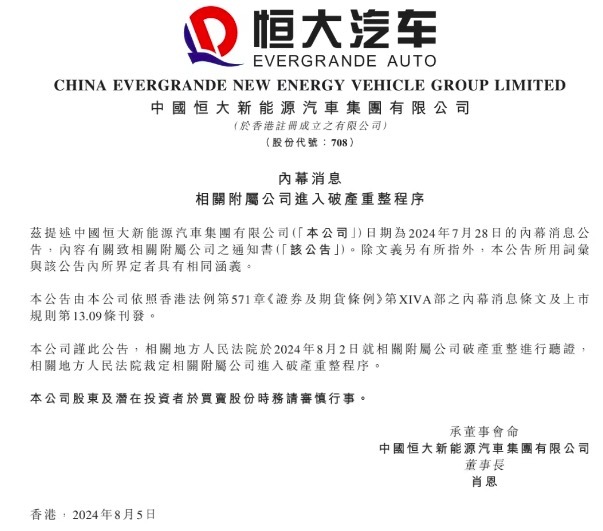 目前,恒大汽车旗下两家附属公司——恒大新能源汽车(广东)有限公司及恒大智能汽车(广东)有限公司,于7月25日被个别债权人破产重整。8月5日,恒大汽车发布公告称:“相关地方人民法院于2024年8月2日就相关附属公司破产重整进行听证,相关地方人民法院裁定相关附属公司进入破产重整程序。”