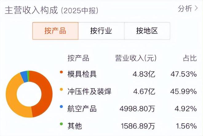 在主营业务表现羸弱的情况下,天汽模也在积极寻求新的增长曲线,该公司将业务拓展至航空领域。不过从营收占比来看,该业务对公司业绩的贡献依然较小。2025年上半年,航空产品实现营收4998.80万元,营收占比不足5%。
