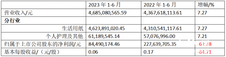 2023年8月29日,中顺洁柔纸业股份有限公司发布2023年半年度报告。报告显示,2023年上半年,营业收入46.85亿元,同比增加7.27%。归属于上市公司股东的净利润约8,449.02万元,较上年同期减少62.88%。基本每股收益0.06元/股。