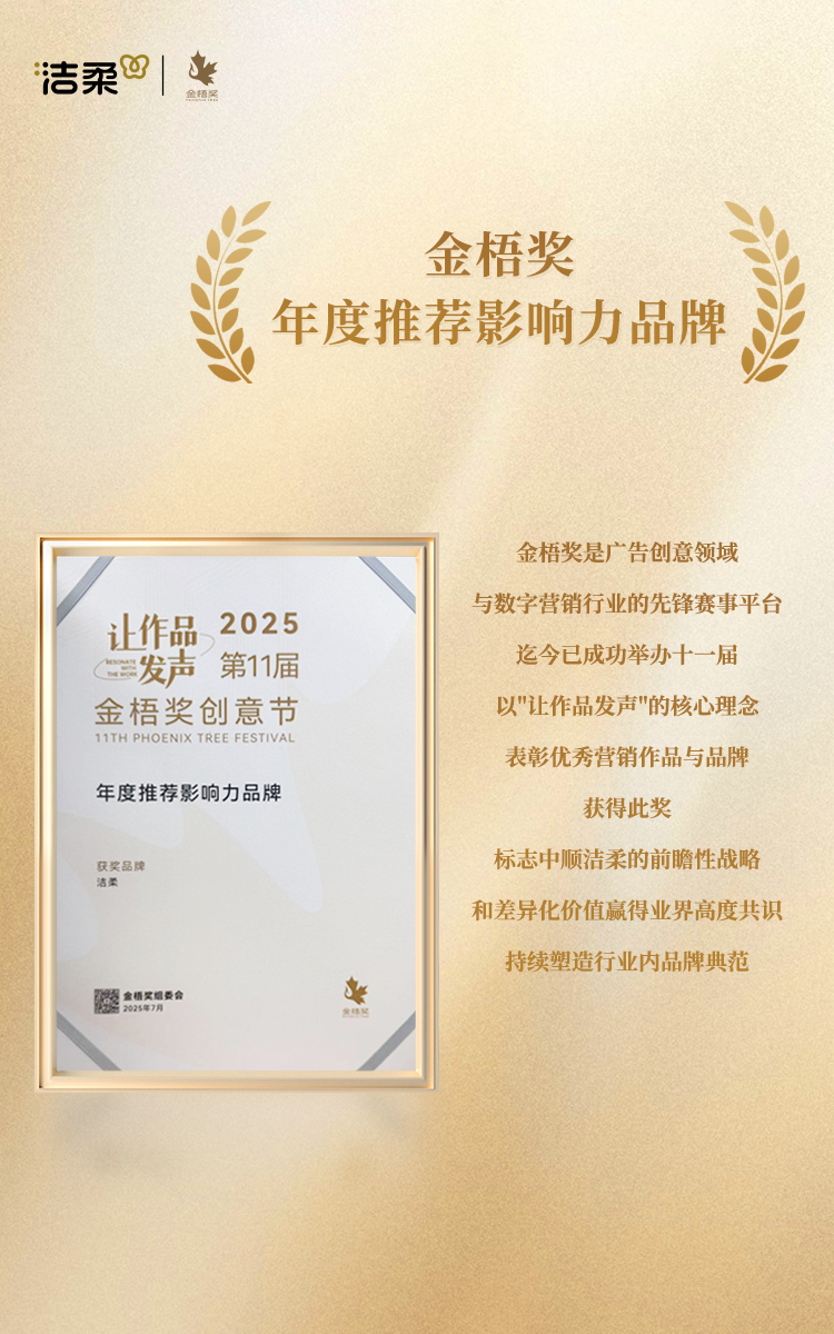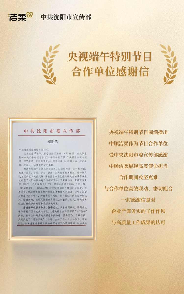 近日,中顺洁柔在品牌营销力、ESG可持续发展、数字化人才管理、跨界协作四大领域传来佳音,接连获得金梧奖-年度推荐影响力品牌大奖、2025 Wind ESG AA评级、2024专业雇主数字化先锋TOP30以及央视端午特别节目合作单位感谢四项认可!四项荣誉加身,是对中顺洁柔过往深耕实绩的专业肯定。