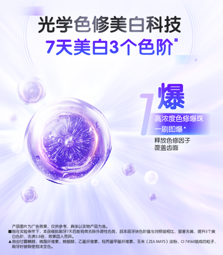 [2]指在实验条件下,本品模拟刷牙7天后能有效去除外源性色斑,且本品牙块色阶值与对照组相比,显著去黄,提升3个美白色阶,去渍3.8倍,效果因人而异。
