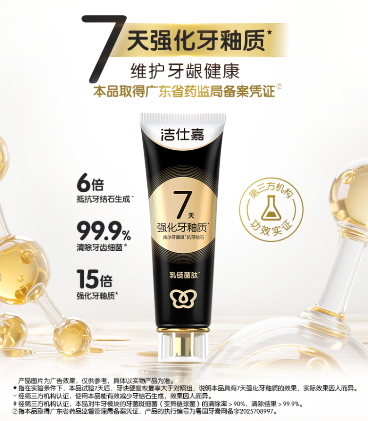 洁仕嘉强釉健齿牙膏专注牙龈健康,特别添加活性乳链菌肽成分,第三方检测数据显示,产品99%清除牙齿细菌[4],6倍抗牙结石生成[5],7天强化15倍牙釉质[6]。