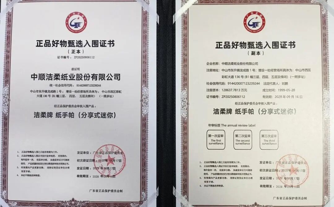硬核品质,再获认可!近日,洁柔艺术油画和分享手帕纸两款产品,凭借卓越品质与市场口碑,成功入选广东省“正品好物”,并获得广东省正品保护委员会颁发的《正品好物甄选入围证书》,以过硬品质诠释中顺洁柔47年来对质量初心的一贯坚守。