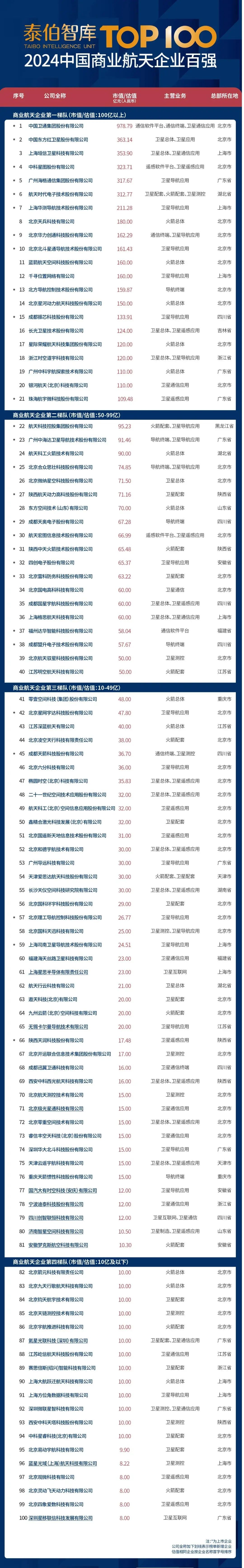 这已是泰伯智库连续四年发布该榜单,本年度榜单延续泰伯智库发布的《中国商业航天产业研究报告》中的商业航天定义,基于泰伯智库认为可靠的、公开披露的融资信息及企业调研数据,以市值(估值)大小确定100家入选企业名单。