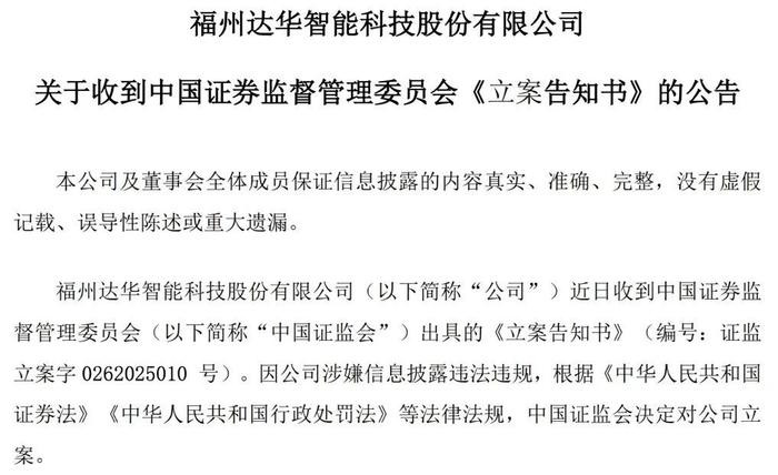 2025年7月28日晚间,福州达华智能科技股份有限公司(下称达华智能,002512.SZ)发布两则重要公告。其一,该公司因涉嫌信息披露违法违规,于近日收到中国证监会出具的《立案告知书》,达华智能表示将积极配合调查工作。