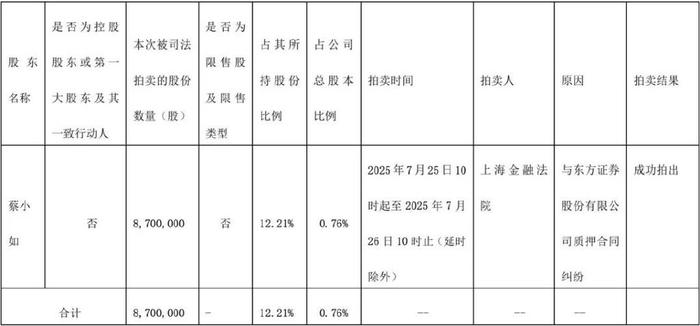 其二,达华智能披露了持股5%以上股东蔡小如所持部分股份被司法拍卖的最新进展:上海金融法院在淘宝网司法拍卖网络平台,公开拍卖蔡小如持有的达华智能870万股股份,最终以3883.68万元成交,拍卖事由系蔡小如与东方证券股份有限公司的质押合同纠纷。