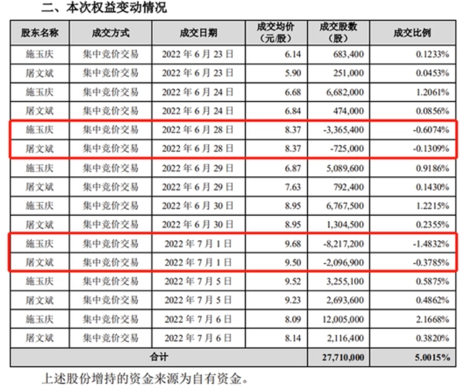 7月6日,屠文斌与施玉庆通过集中竞价方式增持公司股票1412.14万股,约占公司总股本的2.5488%。此次增持后,屠文斌、施玉庆合计持有公司股份2771万股,约占公司总股本比例为5.0015%。
