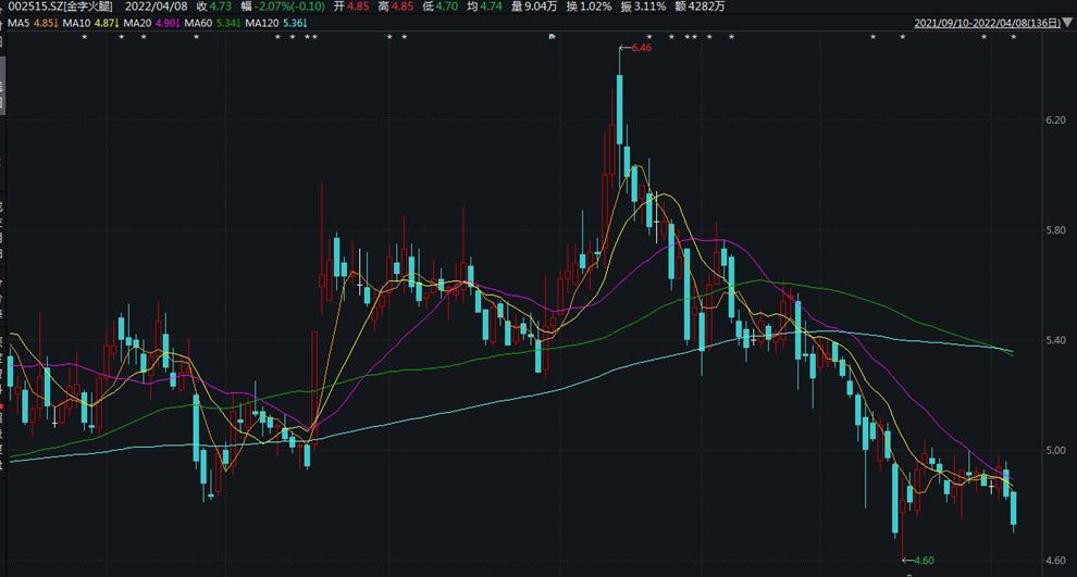 今年1月中旬以来,金字火腿股价一路下跌,从6.46元/股跌至4.73元/股,跌幅超23%,截至4月8日收盘,金字火腿总市值46亿元。