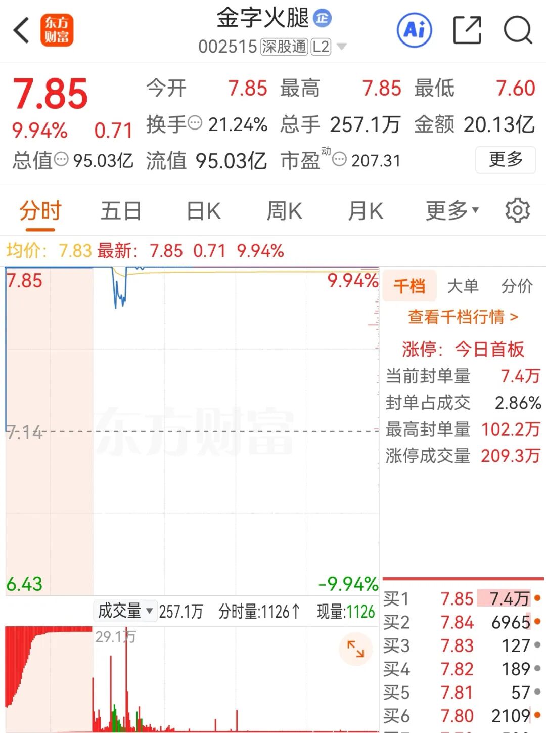 9月23日,金字火腿(002515.SZ)发布公告称,其全资子公司福建金字半导体有限公司拟以不超过3亿元自有或自筹资金,通过增资扩股方式取得中晟微电子(杭州)有限公司不超过20%股权。此次跨界瞄准AI与光通信产业,核心逻辑在于看好行业前景及标的公司的光通信芯片国产替代能力,而这一动作也迅速引发市场热烈反响——公告发布当日,金字火腿在盘前集合竞价阶段即涨停,涨停板位置排队买单超1亿股,对于总股本仅12亿股的公司而言,市场对其股价后续连涨预期显著。