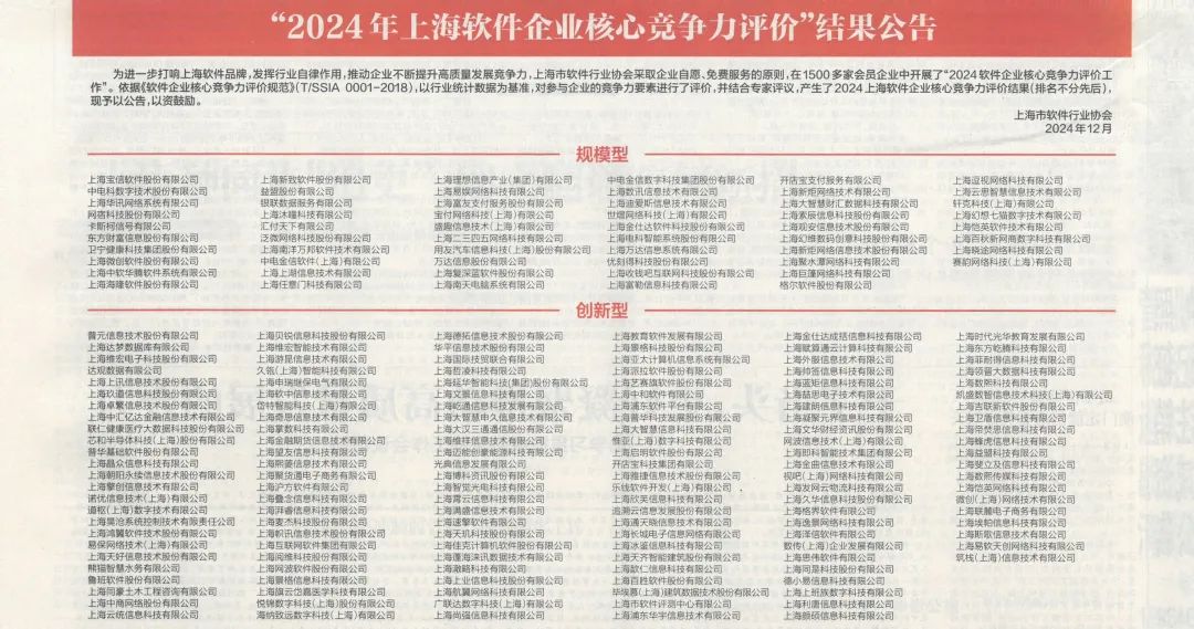 上海软件企业核心竞争力评价是推动上海软件高质量发展的重要活动之一,评价结果以《软件企业核心竞争力评价规范》(T/SSIA0001-2018)为依托,以行业统计数据为基准,经对参评企业的经营业绩、科研能力、创新成效和质量保证等方面的竞争力进行评价而产生。