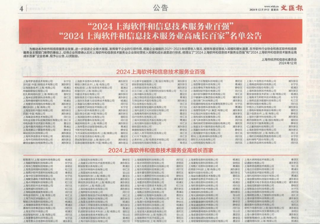“上海软件和信息技术服务业高成长百家”企业是上海市经济和信息化委员会为推动上海市软件和信息服务业发展,进一步促进企业做大做强,发挥骨干企业的引领作用而设立的重要评价项目,其综合考量企业近三年的经营收入规模和增长速度,按照数据排名梳理得出。