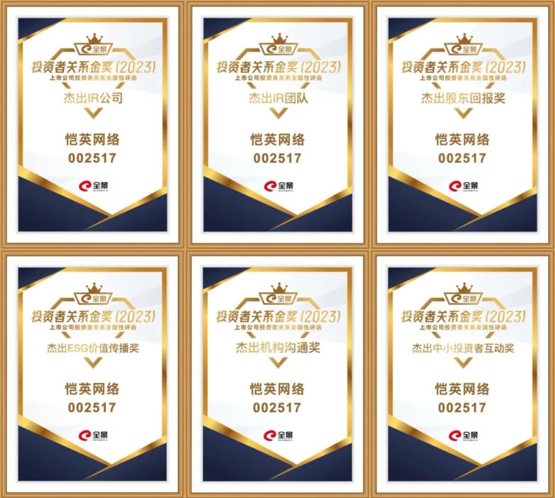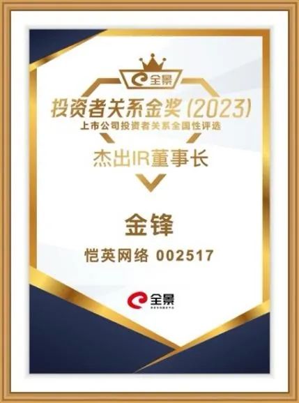 经过严格筛选与评审,恺英网络(002517.SZ)凭借在企业治理、投资者沟通等方面的卓越表现脱颖而出,一举摘得包括“杰出IR公司”“杰出IR团队”“杰出股东回报奖”“杰出ESG价值传播奖”“杰出机构沟通奖”以及“杰出中小投资者互动奖”在内的多项荣誉,恺英网络董事长金锋先生荣获“杰出IR董事长”奖项。