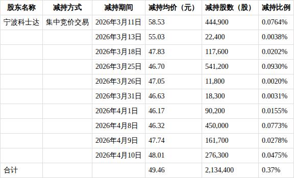 公告显示,宁波科士达于2026年2月10日披露减持计划,拟在披露之日起15个交易日后的三个月内,以大宗交易或集中竞价方式减持不超过582.22万股,占公司总股本的1%。2026年3月11日至4月10日期间,宁波科士达通过集中竞价交易累计减持213.44万股,占公司总股本的0.37%,减持均价为49.46元/股。