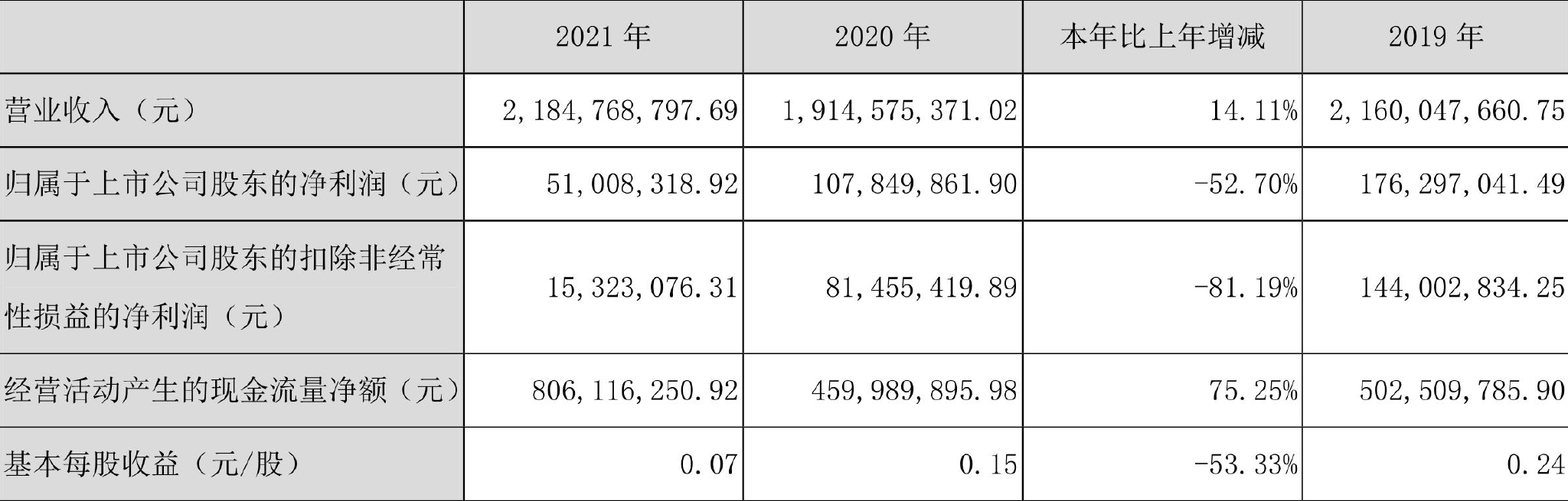 日发精机(002520)4月29日披露2021年年度报告,公司实现营业总收入21.85亿元,同比增长14.11%;归母净利润5100.83万元,同比下降52.70%;扣非净利润1532.31万元,同比下降81.19%;经营活动产生的现金流量净额为8.06亿元,同比增长75.25%;基本每股收益为0.07元,加权平均净资产收益率为1.63%。