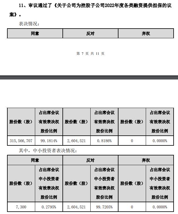 表决结果显示,所有议案都未得到全票通过,每项议案都有中小投资者投下反对票。其中,《关于公司为控股子公司2022年度各类融资提供担保的议案》、《关于董事、监事及高管薪酬方案的议案》遭到反对力度最大。