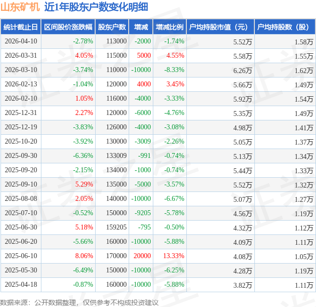 近日山东矿机披露,截至2026年4月10日公司股东户数为11.3万户,较3月31日减少2000.0户,减幅为1.74%。户均持股数量由上期的1.55万股增加至1.58万股,户均持股市值为5.52万元。
