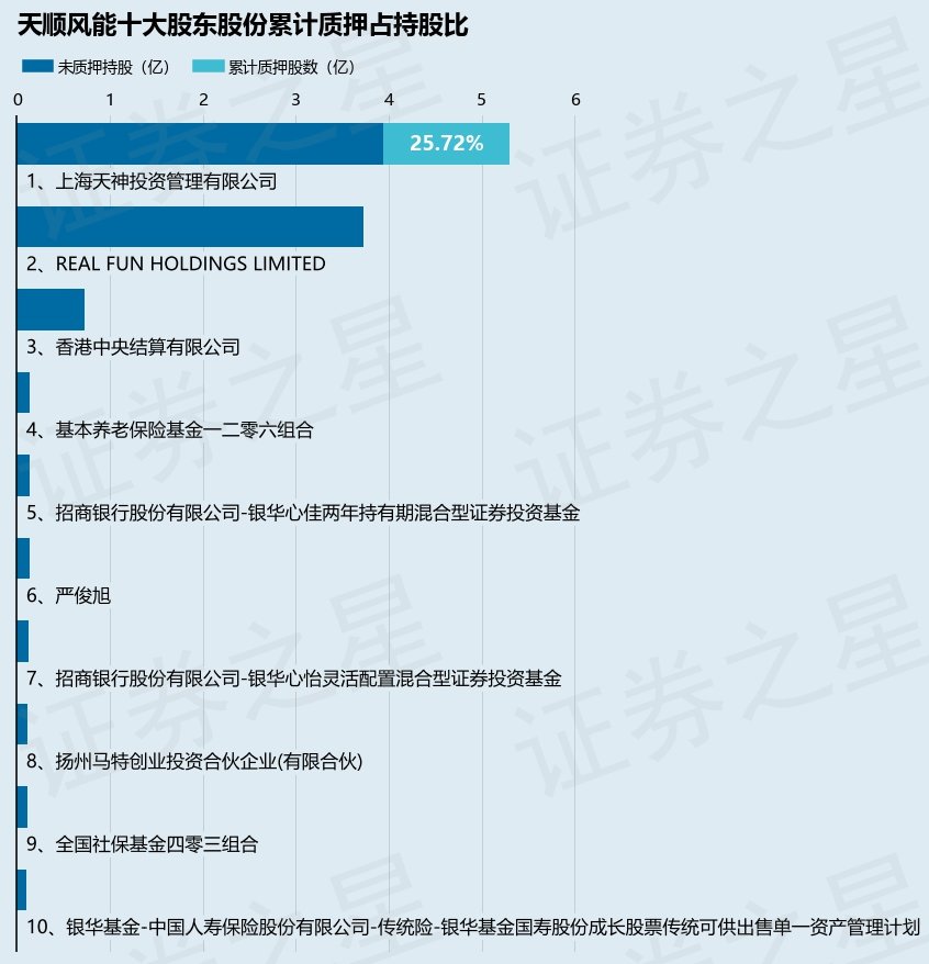 截止本公告日,股东上海天神投资管理有限公司已累计质押股份1.36亿股,占其持股总数的25.72%。本次质押后天顺风能(002531)十大股东的累计质押股份占持股比例见下图: