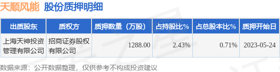 天顺风能(002531)5月25日公开信息显示,股东上海天神投资管理有限公司向招商证券(600999)股权有限公司合计质押1288.0万股,占总股本0.71%。质押详情见下表: