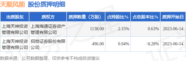 天顺风能(002531)6月16日公开信息显示,股东上海天神投资管理有限公司向上海海通证券资产管理有限公司、招商证券股份有限公司合计质押1634.0万股,占总股本0.91%。质押详情见下表: