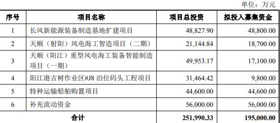 本次发行的募集资金总额不超过195,000.00万元(含本数),扣除发行费用后的募集资金净额将全部用于长风新能源装备制造基地扩建项目、天顺(射阳)风电海工智造项目(二期)、天顺(阳江)重型风电海工装备智能制造项目(一期)、阳江港吉树作业区#J8泊位码头工程项目、特种运输船舶购置项目、补充流动资金。