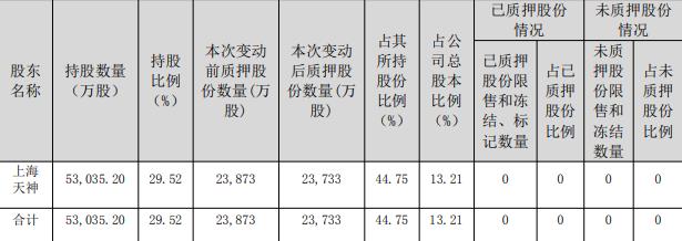 公司11月14日披露的关于控股股东部分股份解质押及质押展期的公告显示,公司近日接到控股股东上海天神通知,上海天神将其所持公司1.45%的股份办理了质押展期业务,质权人分别为 中信证券 、 中金财富 ;将其所持公司0.08%的股份办理了解除质押业务,质权人为 银河证券 、 东吴证券 、 国联民生 。截至公告披露日,上海天神本次变动后质押股份数量23,733万股,占其所持股份比例44.75%,占公司总股本比例13.21%。