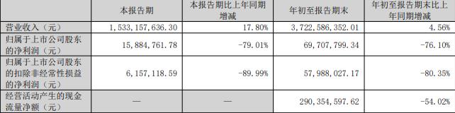 年初至报告期末,公司实现营业收入37.23亿元,同比增长4.56%;归属于上市公司股东的净利润6970.78万元,同比减少76.10%;扣除非经常性损益后的净利润5798.80万元,同比减少80.35%;经营活动产生的现金流量净额2.90亿元。