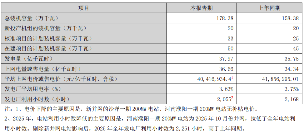 2025年,公司在风电场开发、建设方面成果显著:河南濮阳一期200MW风电场已实现并网;公司已入库项目建设指标累计1030MW,其中京山一二期、钟祥一二期合计500MW项目已开工建设,已开工项目预计将于2026年中开始陆续并网;京山三期、沙洋驭风、合浦一期合计330MW项目已获核准;另有200MW项目已获取建设指标,正积极推进后续审批。