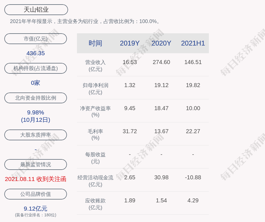 2021年半年报显示,天山铝业的主营业务为铝行业,占营收比例为:100.0%。