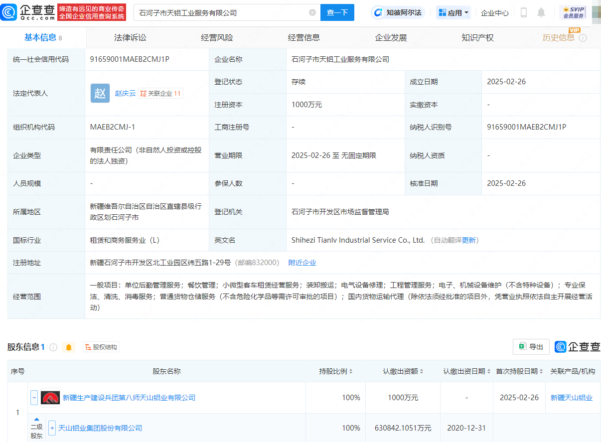 近日,石河子市天铝工业服务有限公司成立,法定代表人为赵庆云,注册资本为1000万元,经营范围包含:单位后勤管理服务;餐饮管理;小微型客车租赁经营服务;装卸搬运;电气设备修理;工程管理服务等。企查查股权穿透显示,该公司由天山铝业(002532)间接全资持股。