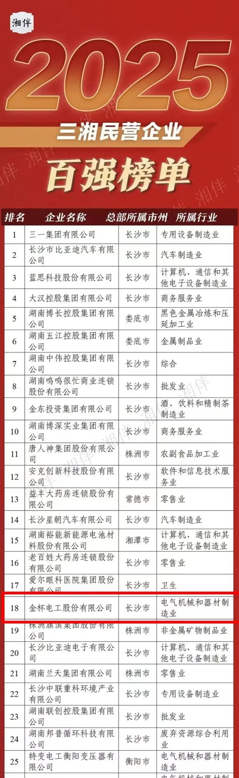 12月18日,2025三湘民营企业百强榜新闻发布会在长沙隆重举行,金杯电工凭借稳健的经营业绩与强劲的发展动能,连续多年上榜并位列第18位,与三一集团、长沙市比亚迪汽车等知名企业共同跻身湖南民企第一梯队,彰显了线缆行业龙头企业的硬核实力。