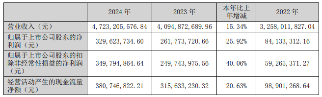 2024年,公司实现营业收入47.23亿元,同比增长15.34%;归属于上市公司股东的净利润3.30亿元,同比增长25.92%;归属于上市公司股东的扣非净利润3.50亿元,同比增长40.06%;经营活动产生的现金流量净额为3.81亿元,同比增长20.63%。
