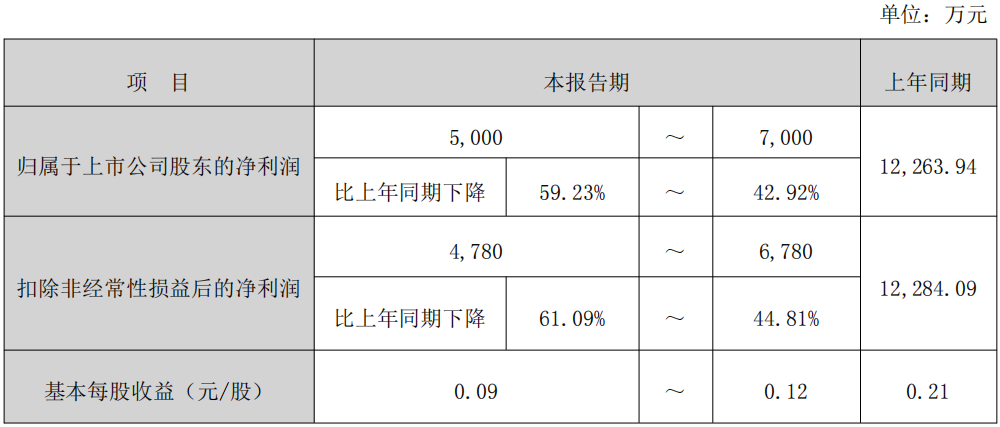 扣除非经常性损益后的净利润预计为4,780万元至6,780万元,上年同期为12,284.09万元,同比下降61.09%至44.81%。基本每股收益预计为0.09元至0.12元,而上年同期为0.21元。