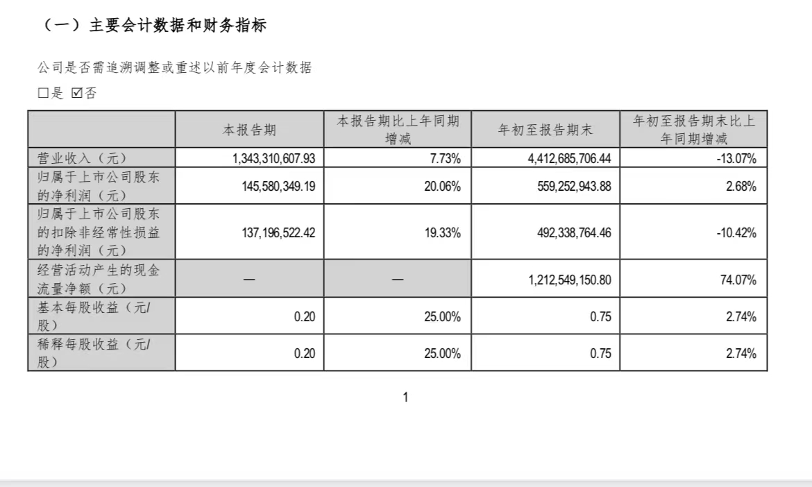 根据公告,2023年第三季度,万和电气实现营收13.43亿元,同比增7.73%;归属于上市公司股东的净利润1.46亿元,同比增20.06%。