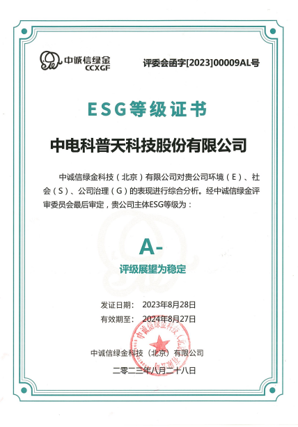 近日,中诚信绿金科技(北京)有限公司(以下简称“中诚信绿金”)发布了《中电科普天科技股份有限公司2023年度ESG评级报告》,经中诚信绿金对中电科普天科技股份有限公司(以下简称“普天科技”)环境(E)、社会(S)、公司治理(G)的表现进行综合分析,给与普天科技ESG(环境、社会与公司治理)等级A-,评级展望为稳定,有效期为2023年8月28日至2024年8月27日。