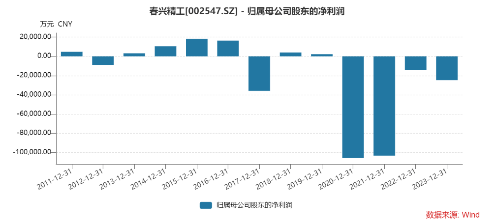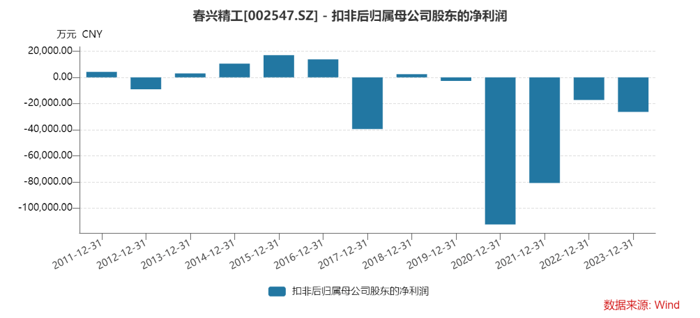 但是,春兴精工上市第二年,即2012年就出现业绩亏损。Wind数据显示,2011-2023年的13年间,春兴精工的归母净利润亏损过6年,扣非归母净利润亏损过7年,其中2019年至2023年连续亏损5年。