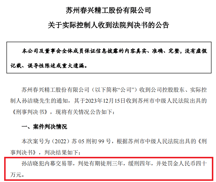 值得注意的是,孙洁晓2023年12月因犯内幕交易罪,被苏州市中级人民法院“判处有期徒刑三年,缓刑四年,并处罚金人民币四十万元”。何时能够收回上述4.43亿元,孙洁晓究竟还有多少资产能够偿债,春兴精工目前尚没有披露明确的还款时间表。