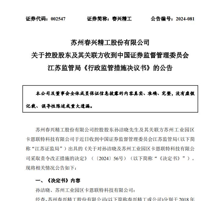 近日,春兴精工股份有限公司(以下简称“春兴精工”)发布公告,披露了其控股股东孙洁晓及其关联方苏州工业园区卡恩联特科技有限公司(以下简称“卡恩联特”),因超期未履行承诺,被江苏证监局采取责令改正的监管措施,并将相关情况记入证券期货市场诚信档案。