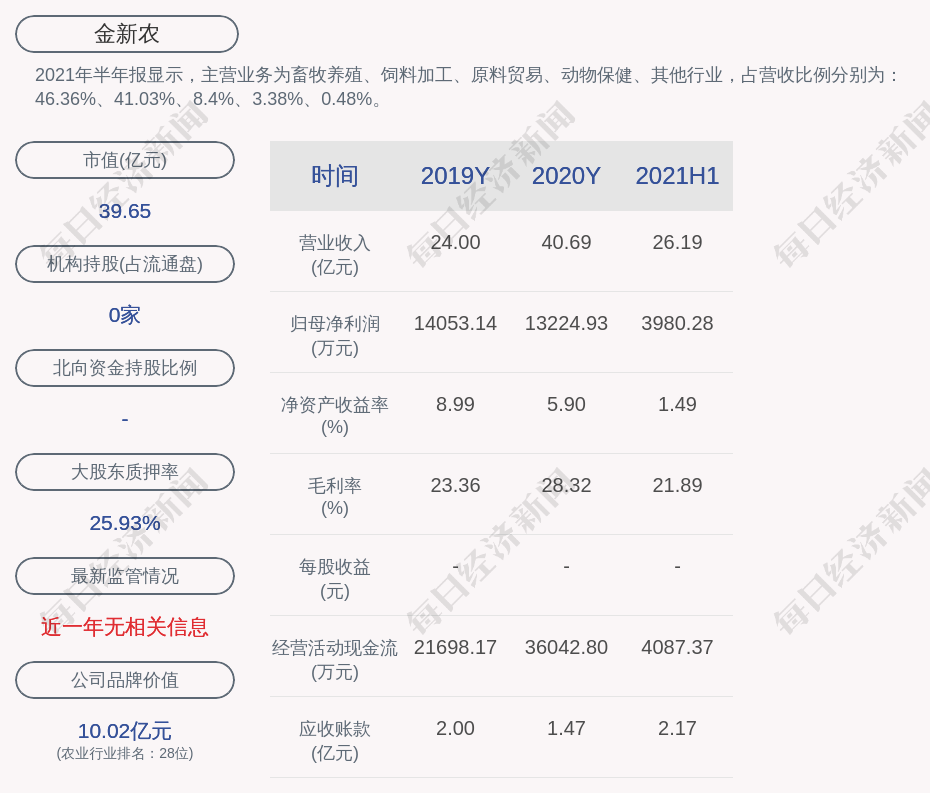 2021年半年报显示,金新农的主营业务为畜牧养殖、饲料加工、原料贸易、动物保健、其他行业,占营收比例分别为:46.36%、41.03%、8.4%、3.38%、0.48%。