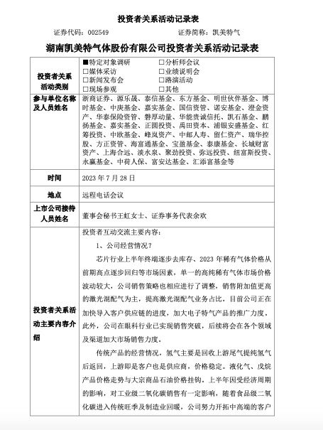 湖南凯美特气体股份有限公司(以下简称“凯美特气”或“公司”)7月28日晚间发布公告称,公司于7月28日接受了多家机构投资者的特定对象调研。在调研中,凯美特气透露,芯片行业上半年终端逐步去库存、2023年稀有气体价格从前期高点逐步回归等市场因素,单一的高纯稀有气体市场价格波动较大,公司销售策略也相应进行了调整,销售附加值更高的激光混配气为主,提高激光混配气业务占比。目前公司正在加快导入客户供应链的进度,加大电子特气产品的推广力度。
