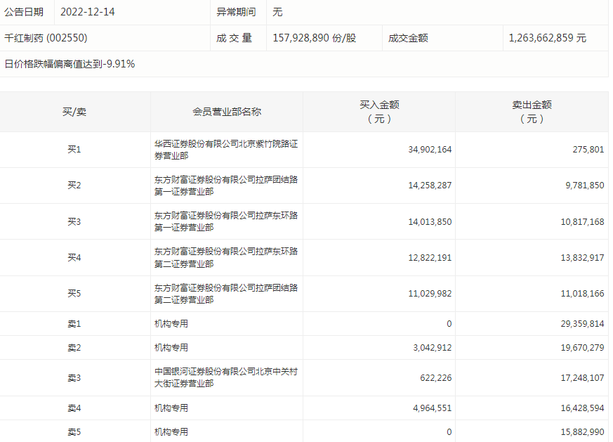 千红制药今天跌停。盘后数据显示,4个机构出现在龙虎榜单上,合计净卖出7333.42万元;华西证券股份有限公司北京紫竹院路证券营业部买入3490.22万元,同时卖出27.58万元;东方财富证券股份有限公司拉萨东环路第二证券营业部买入1282.22万元,同时卖出1383.29万元。