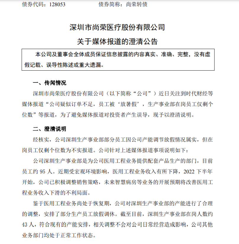 尚荣医疗公告显示,经核实,公司深圳生产事业部部分员工因公司产能调节放假情况属实,但在岗员工仅剩个位数为不实报道。鉴于医用工程业务尚处于恢复期,公司对深圳生产事业部的产能进行了合理的调整,安排了部分生产员工放假调休。截至目前,深圳生产事业部在岗人数约43人,符合现有的产能安排,相关调整不会对公司日常经营造成影响,公司其他业务部门均处于正常工作状态。